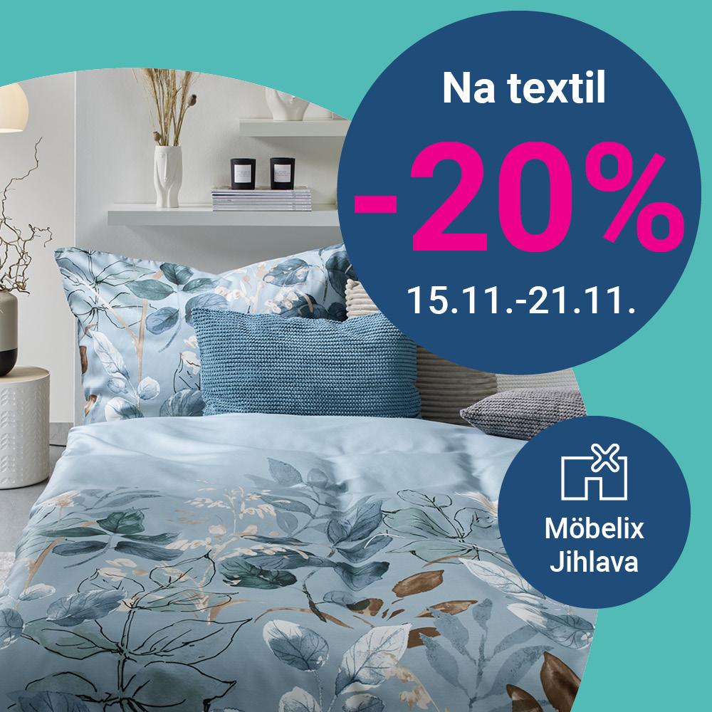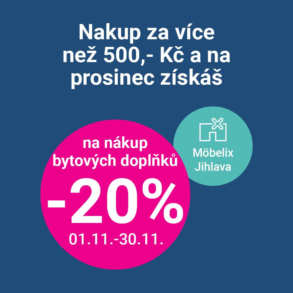 Nakup od 1.11. do 30.11. za více než 500,- Kč, a na prosinec získej slevu 20% na nákup bytových doplňků. Sleva se počítá z běžných prodejních cen, neplatí na zboží označené jako „Výprodej“, „Reklama“, „Cenový trhák“, „1+1 zdarma“ a zboží s dodáním zdarma „Exkluzivně online“. Na jeden nákup je možné použít pouze jeden kupón, slevy nelze kombinovat. Akce platí jen v prodejně Möbelix Jihlava, neplatí pro e-shop a ostatní prodejny.