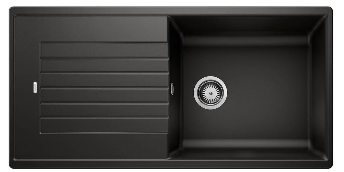 Granitový dřez černé barvy, bez excentrického ovládaní, včetně sifónu, vhodný pro montáž na pracovní desku a do skříňky šířky od 60 cm, obojstranný.