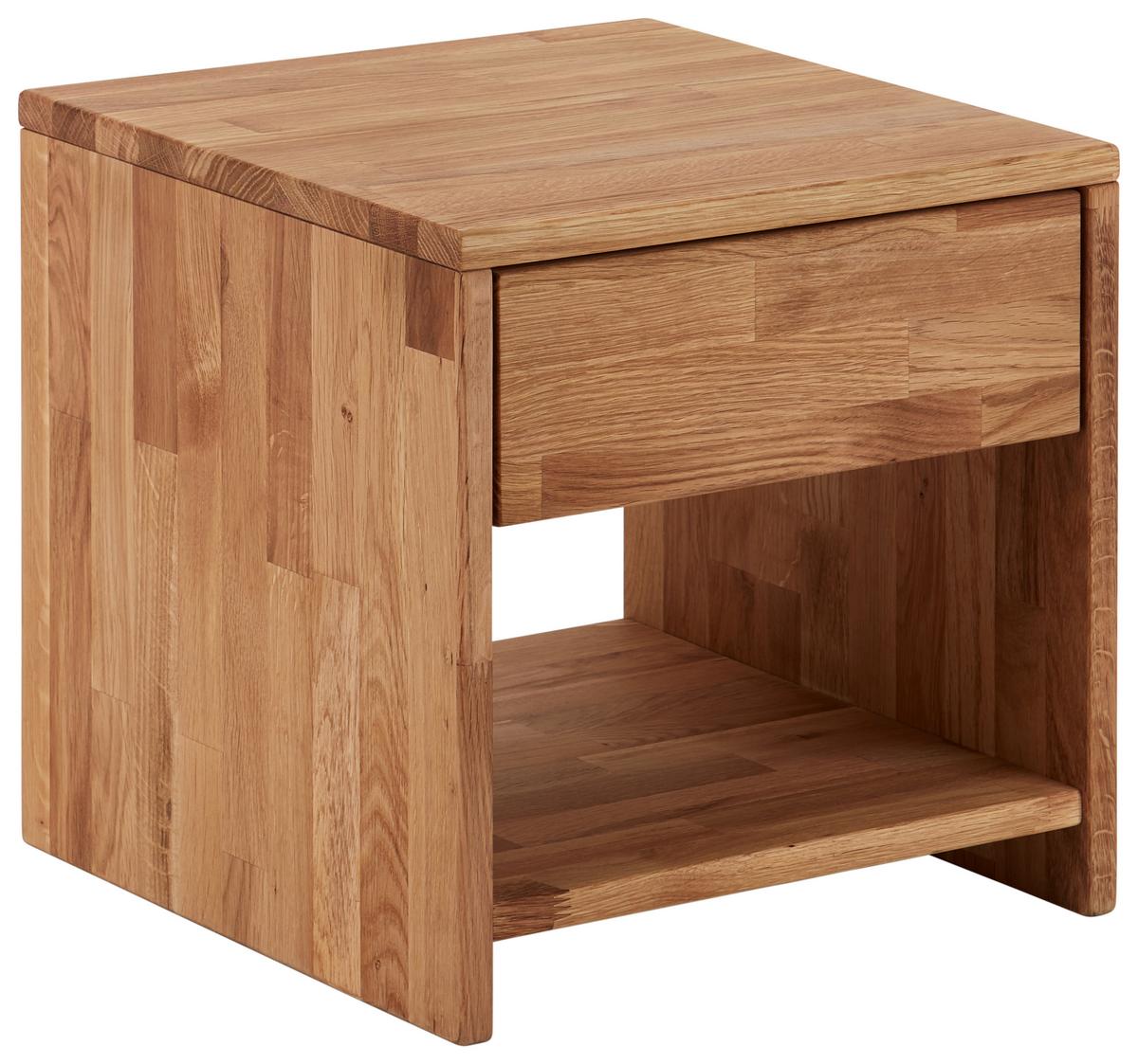 Díky naolejovanému povrchu si přijde na své přirozeně zbarvené zrno modelu. Pro uložení drobností je k dispozici zásuvka, kterou lze otevřít bez úchytů. Zatímco do otevřené přihrádky můžete uložit výběr ze čtení u postele, horní police je ideální pro noční lampičku.